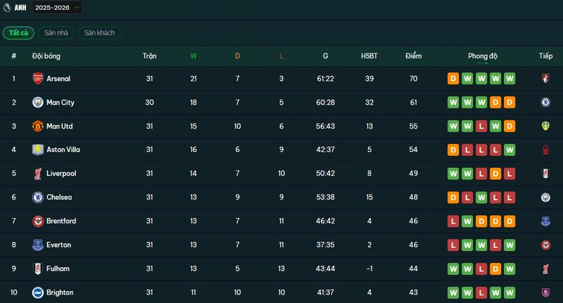 Ngoài ra, 4 đội dẫn đầu sẽ giành vé dự Champions League, tạo thêm động lực cạnh tranh cực kỳ khốc liệt.