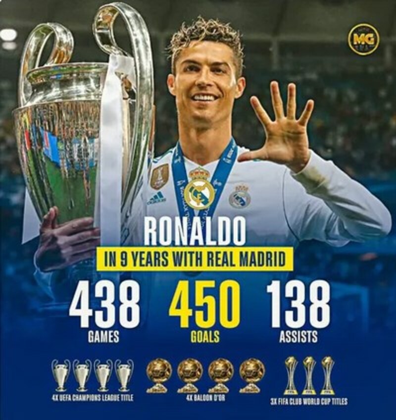 Cristiano Ronaldo ghi 450 bàn trong màu áo Real Madrid, trở thành chân sút xuất sắc nhất lịch sử câu lạc bộ. Trong giai đoạn thi đấu từ 2009 đến 2018, anh không chỉ tỏa sáng với khả năng dứt điểm đa dạng, từ sút xa, đánh đầu đến đệm bóng cận thành, mà còn là nhân tố quan trọng giúp đội bóng giành nhiều danh hiệu quốc nội và quốc tế.